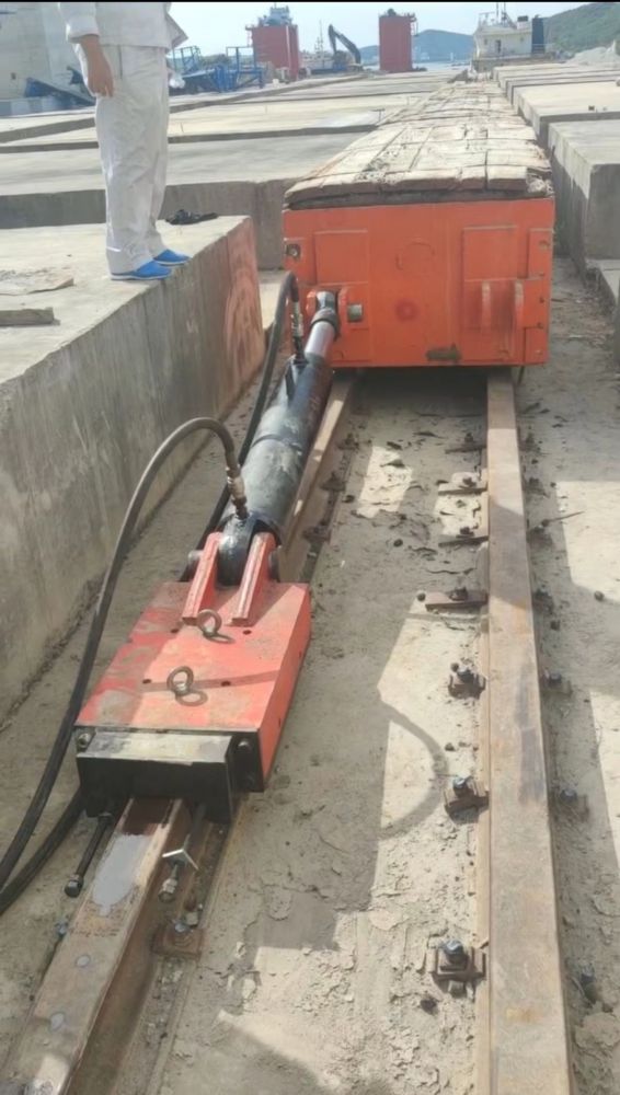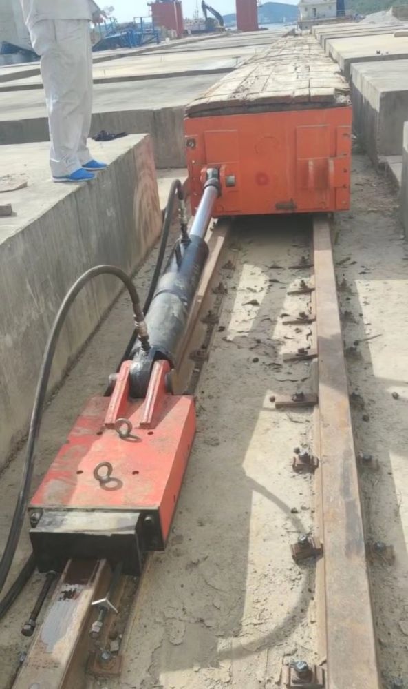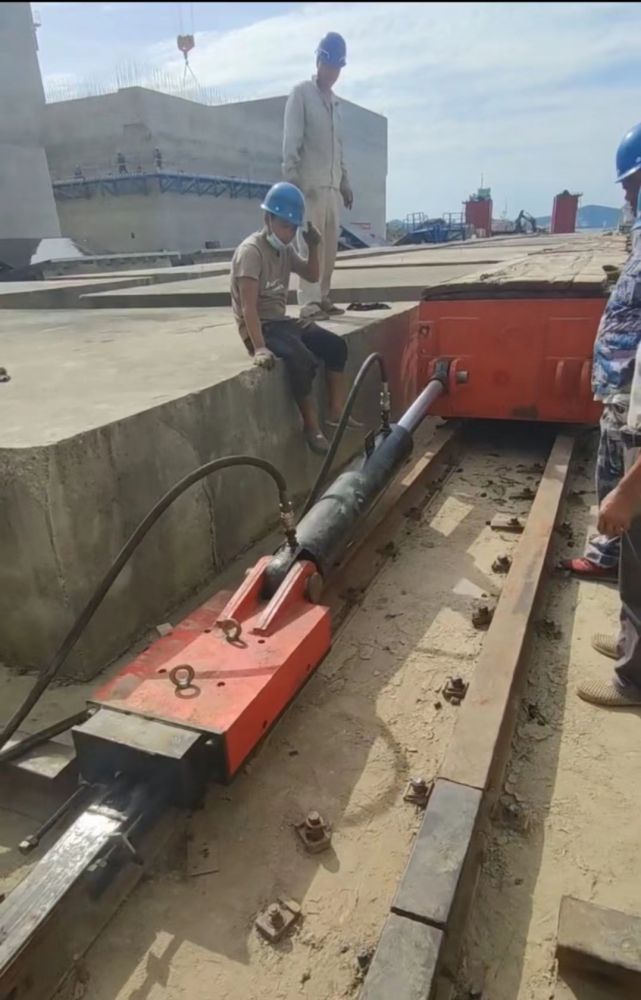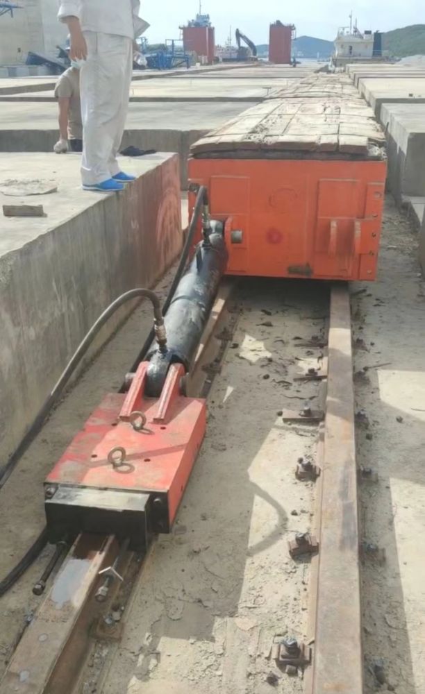頂**缸一端固定在需要頂推工件上,一端固定在夾軌器上,通過頂**缸與支撐液壓缸的動作配合,把工件一步一步向前推動。